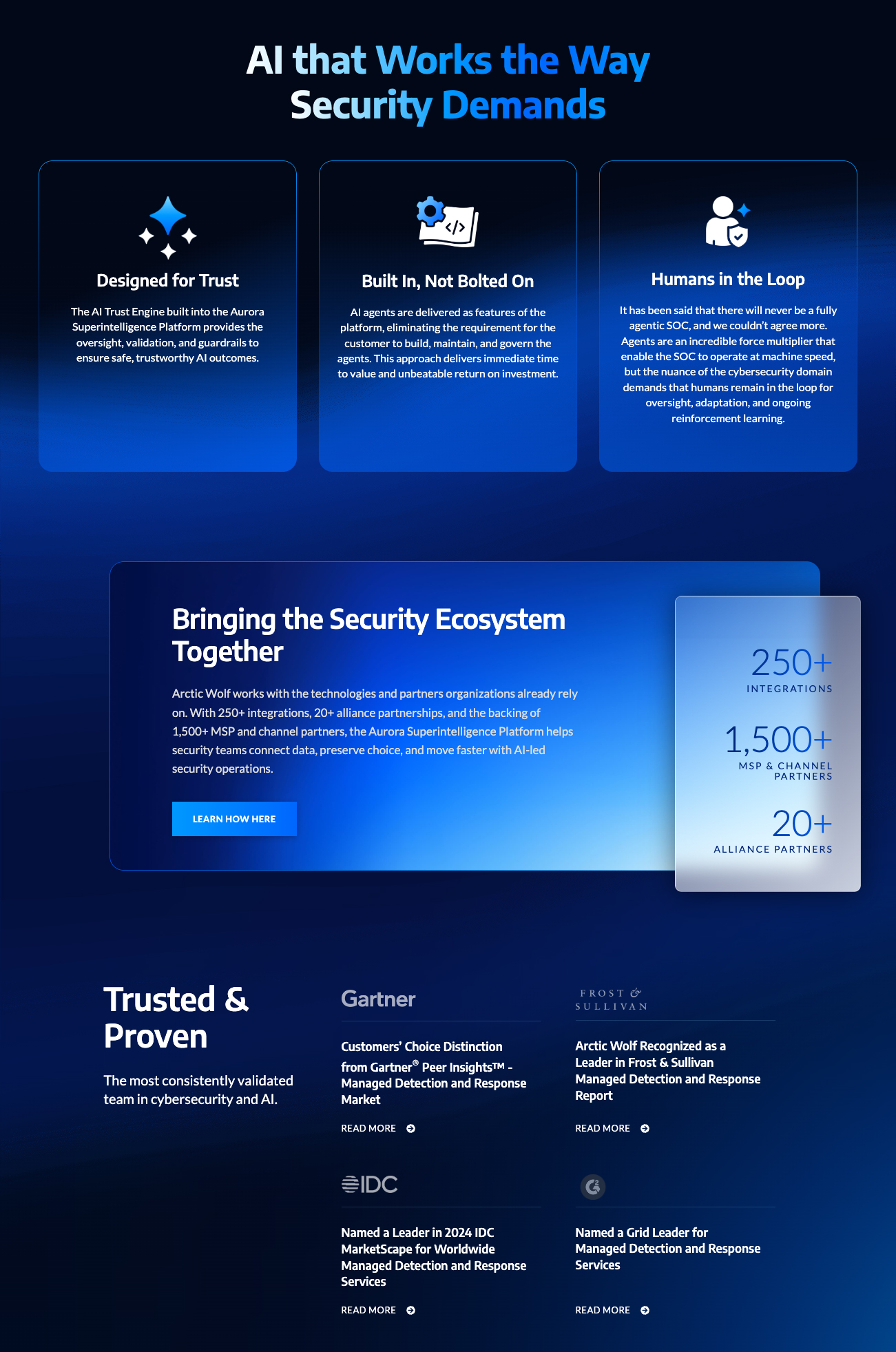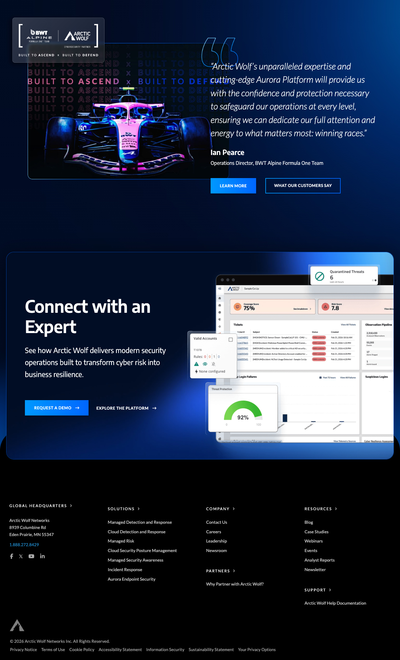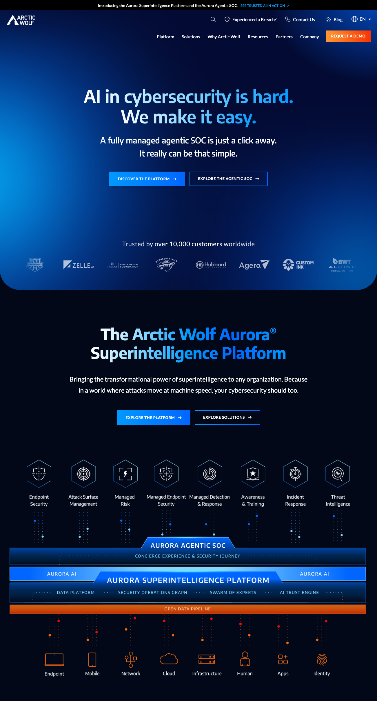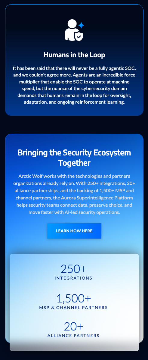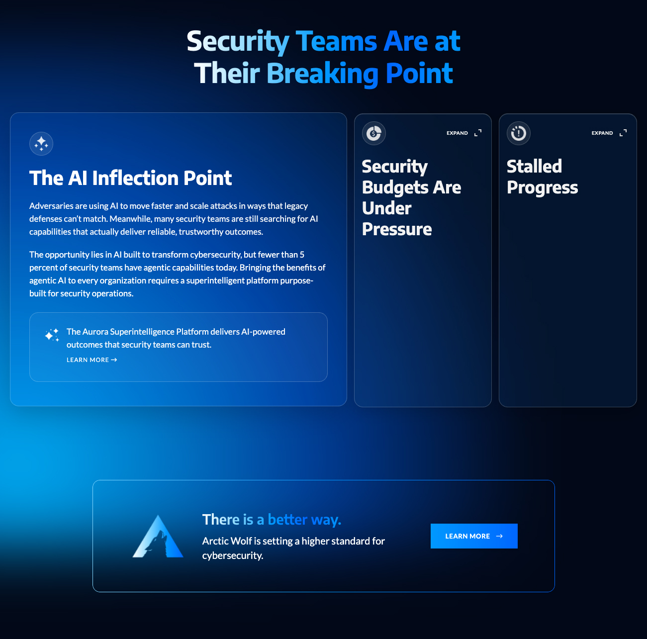 In the lead-up to a major RSA Conference announcement, I reimagined Arctic Wolf’s homepage with updated Aurora messaging, introducing custom modules and visuals, including an interactive cursor-following gradient that’s certainly worth a look 🙂